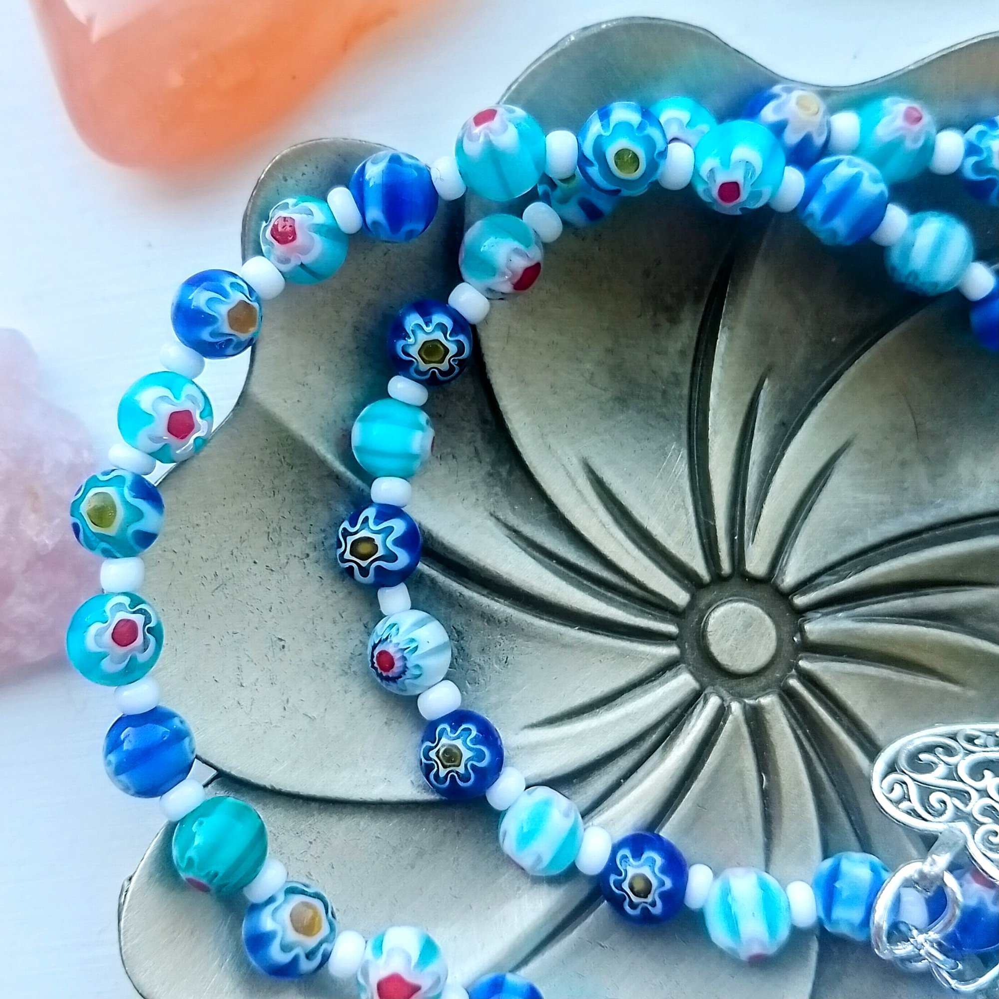 This 16 inch (40.64 cm) necklace pays homage to the rich and vibrant history of Italian Millefiori. Millefiori is a glasswork technique which produces distinctive decorative patterns on glassware. The term millefiori is a combination of the Italian words “mille” meaning thousand, and “fiori” meaning flowers. The millefiori technique involves the production of glass canes or rods, known as murrine, with multicoloured patterns which are viewable only from the cut ends of the cane. A murrine rod is heated in a furnace and pulled until thin while still maintaining the cross-section's design. It is then cut into beads or discs when cooled. This process can be traced back to Ancient Roman, Phoenician and Alexandrian times, as canes, probably made in Italy, have been found as far away as Ireland during digs of archaeological sites from the 8th century. Millefiori beads also have been uncovered from digs at Sandby borg, Öland, Sweden, dating apparently from the late 5th or early 6th century. A piece of millefiori was found, along with unworked garnets, in a purse at the early 7th century Anglo-Saxon burial site at Sutton Hoo, England.
