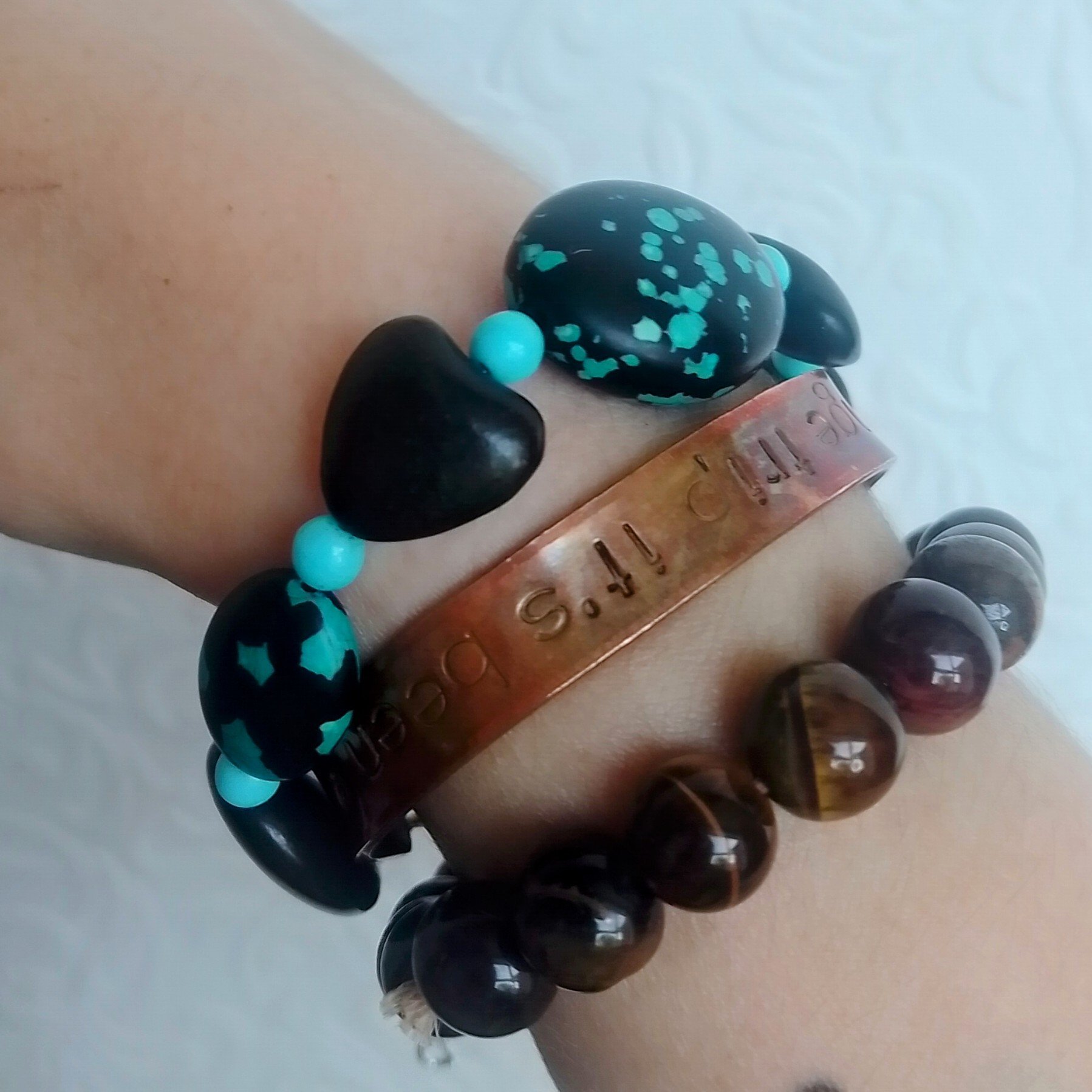 Blue Moon Turquoise is probably one of my favourite stones for its uniqueness and versatility. Bright turquoise blue geometric spots cover the matte black stone as if constellations on a night sky, truly living up to its namesake. Paired with the plain black agate hearts and ovals, you can truly appreciate each stone's design. In between, small turquoise glass beads space out the black and compliment the blue hues seen in the stones.