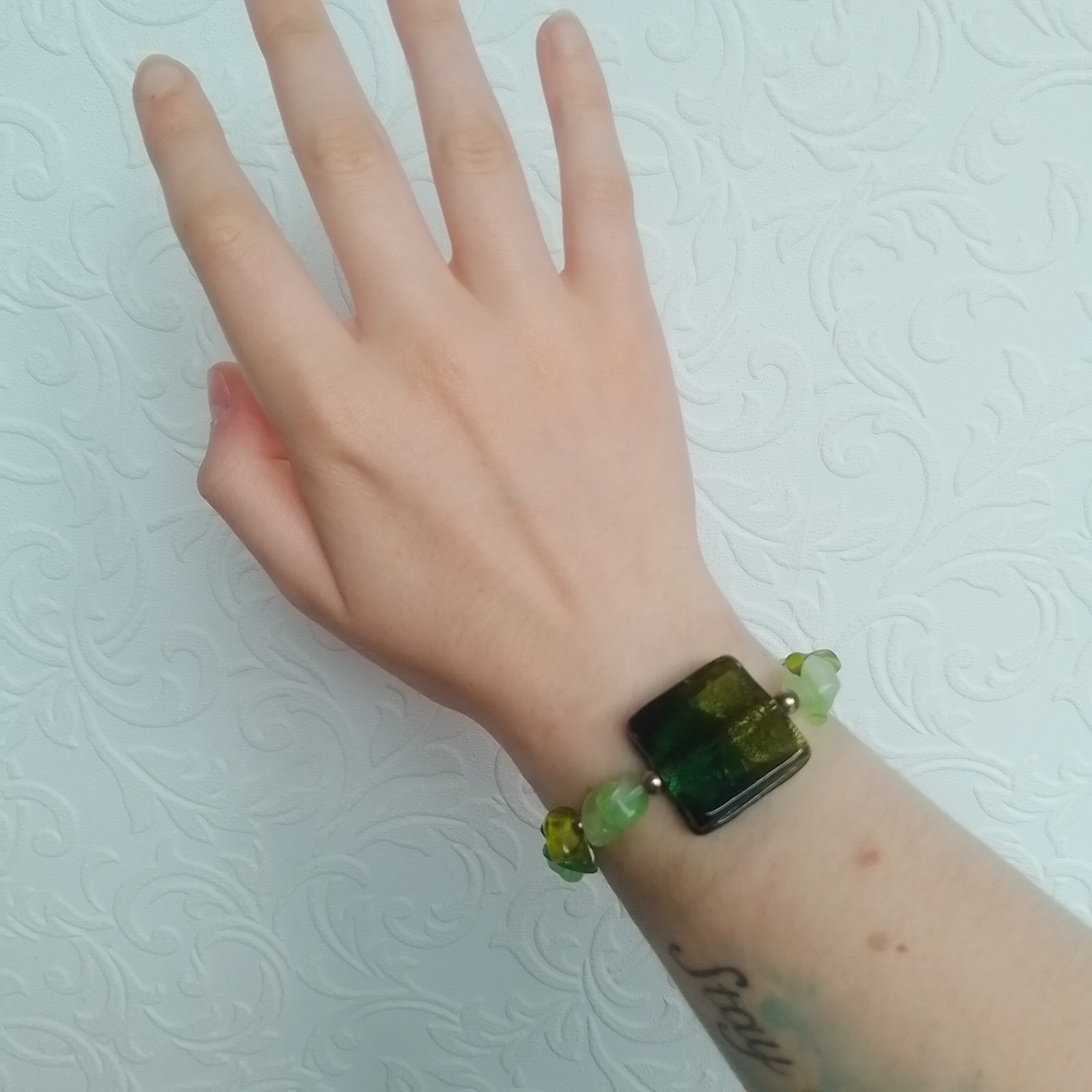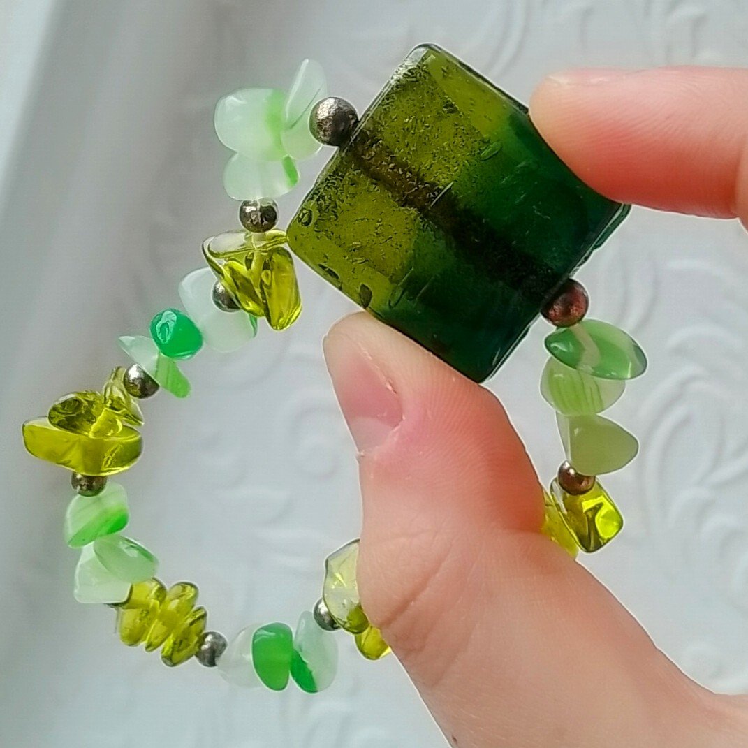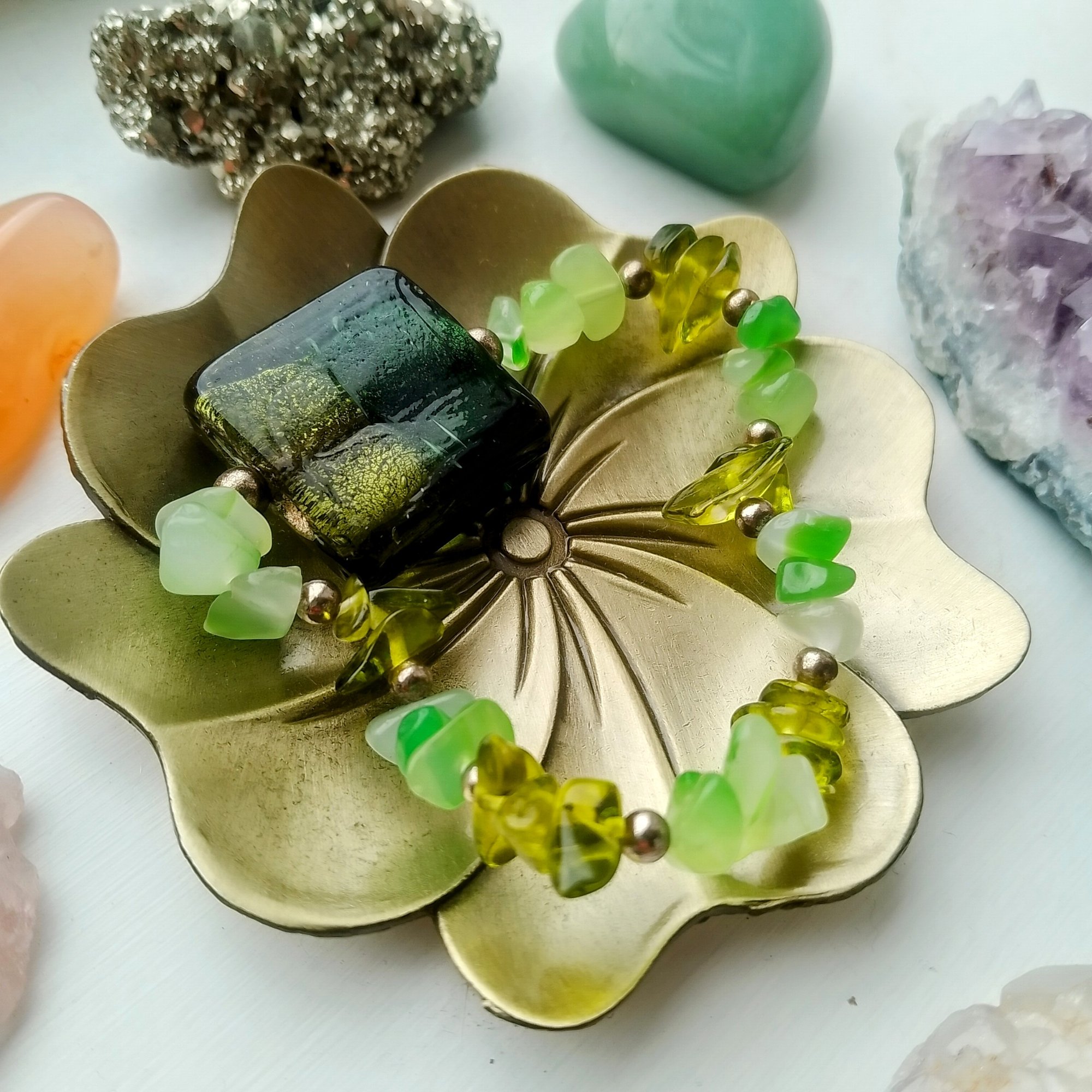 This bracelet reminds me of the rich greens found in forests on spring and summer walks. It features a foiled glass centrepiece with a deep emerald green and bright green ombre effect. Around it, chips of green chalcedony and peridot adorn the bracelet, complementing the green hues. This bracelet has been made to fit most wrist sizes, though if you would prefer a specific size, add your measurement to the notes at checkout, and I will tailor it to you.