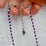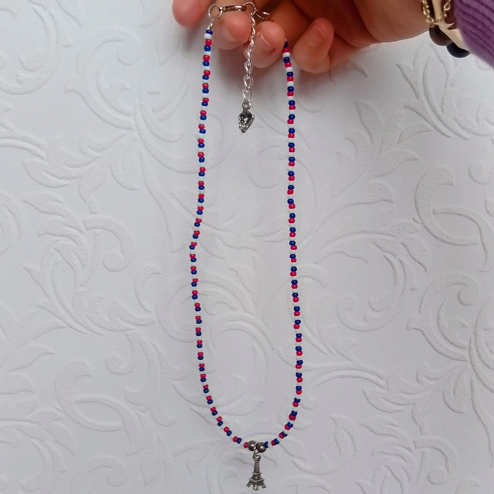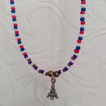 Say “j'aime la France” with this dainty 16 inch (40.64 cm) necklace featuring a tiny Eiffel Tower charm at its centre. Tiny blue, white, and red glass seed beads representing the French flag adorn this necklace, giving it a sense of whimsy that draws the eye, especially when paired with the tiny Eiffel Tower. The necklace is strung on jewellery wire with a lobster claw fastener and metal links to make it adjustable.