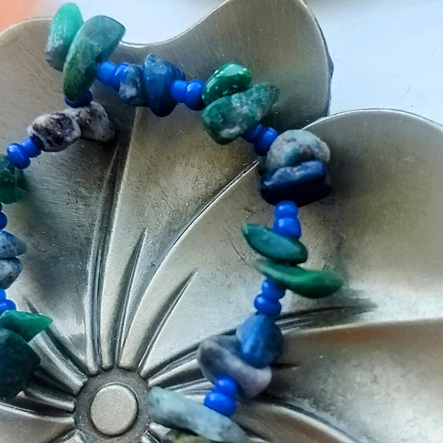 This bracelet is full of deep tones and tiny pops of colour to contrast, making it a great staple piece. The dark lapis at the centre holds tiny bronze flecks and dark blue hues, mesmerising yet understated. Surrounding it, tiny blue glass seed beads space out the alternating green jasper chips and lapis lazuli chips, paired together to create a balanced look. Each chip is like a fingerprint, with its own unique mottling and shape, making it tactile and inviting.