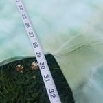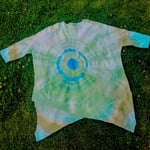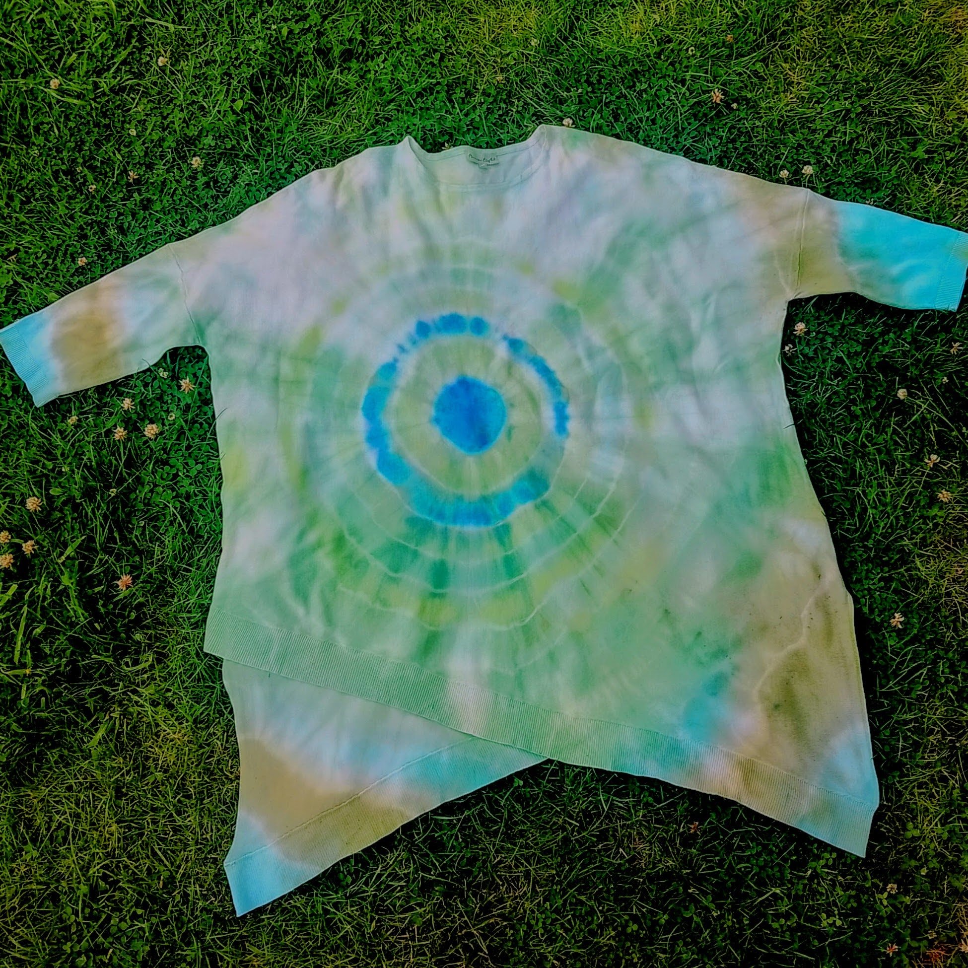 This upcycled sweater is one of my most favourite pieces I've done to date. It features a silky soft texture with asymmetrical edges at the bottom, half-sleeves, and a flattering scoop neckline. I love how flowy it is, and it really invites movement and a sense of playfulness. When I picked it up at the thrift store, there was a small hole in the inner hemline and the once beige material had faded to a sickly off-white. I carefully repaired the hole, and tie-dyed it to give it a fresh lease of life. I used various green and blue hues to create a natural, earthy vibe that compliments the uniqueness of this sweater. Not only that, but I love how the rich blue in the centre of the sweater naturally draws the eye and radiates out. I could see this piece being the perfect cover-up after a rewarding yoga or gym session, or being styled to make a showstopping staple outfit.