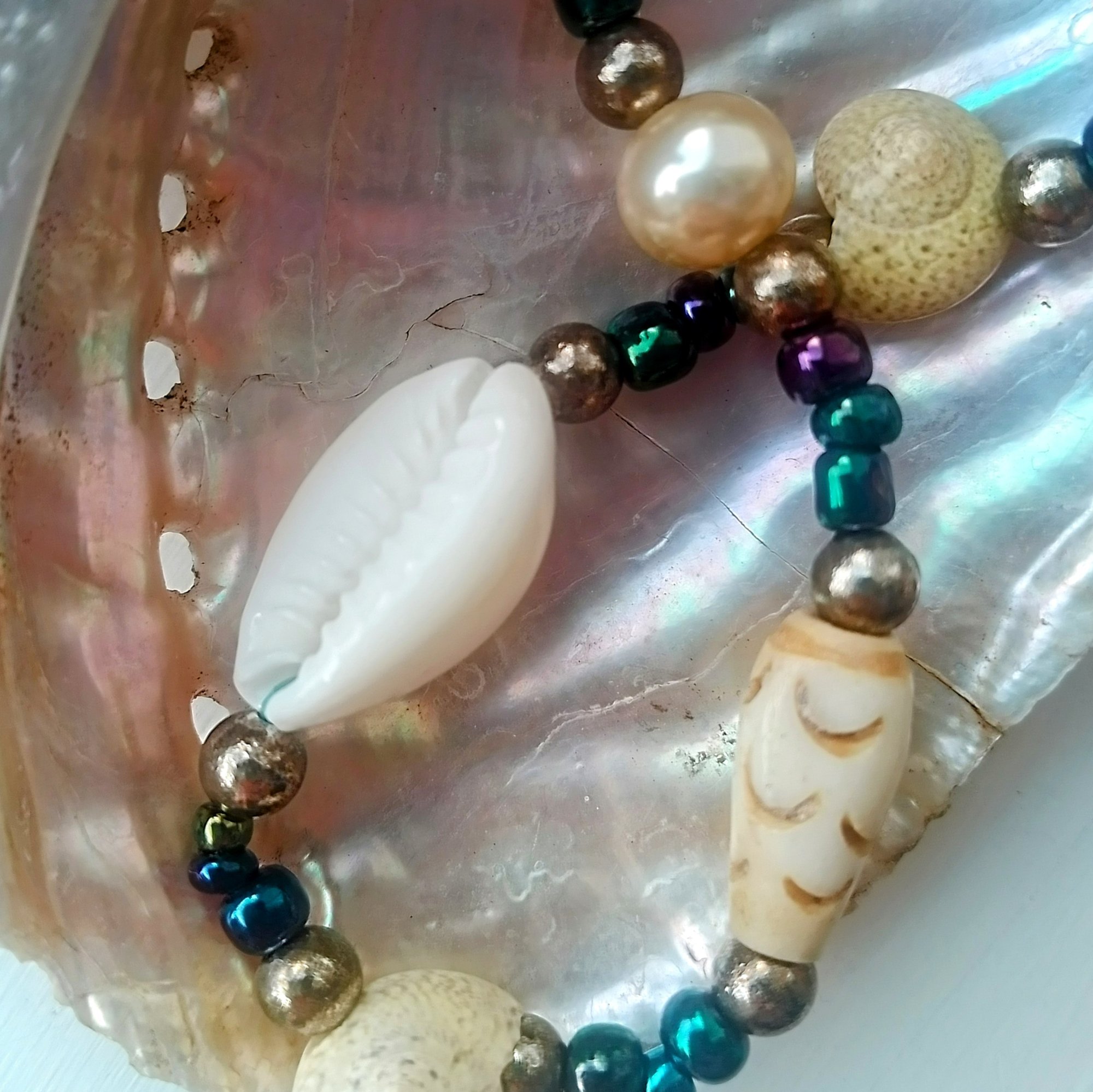 This gorgeous bracelet is made of real pearls, glass metallic seed beads, small metal beads, a cowrie shell, button top sea snail shells, and tagua nut beads. It is the embodiment of ocean life and is perfect for any marine enthusiast. I love how the dainty glass beads have a metallic finish that echoes the colours found in the depths of the seas.
