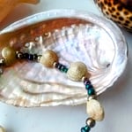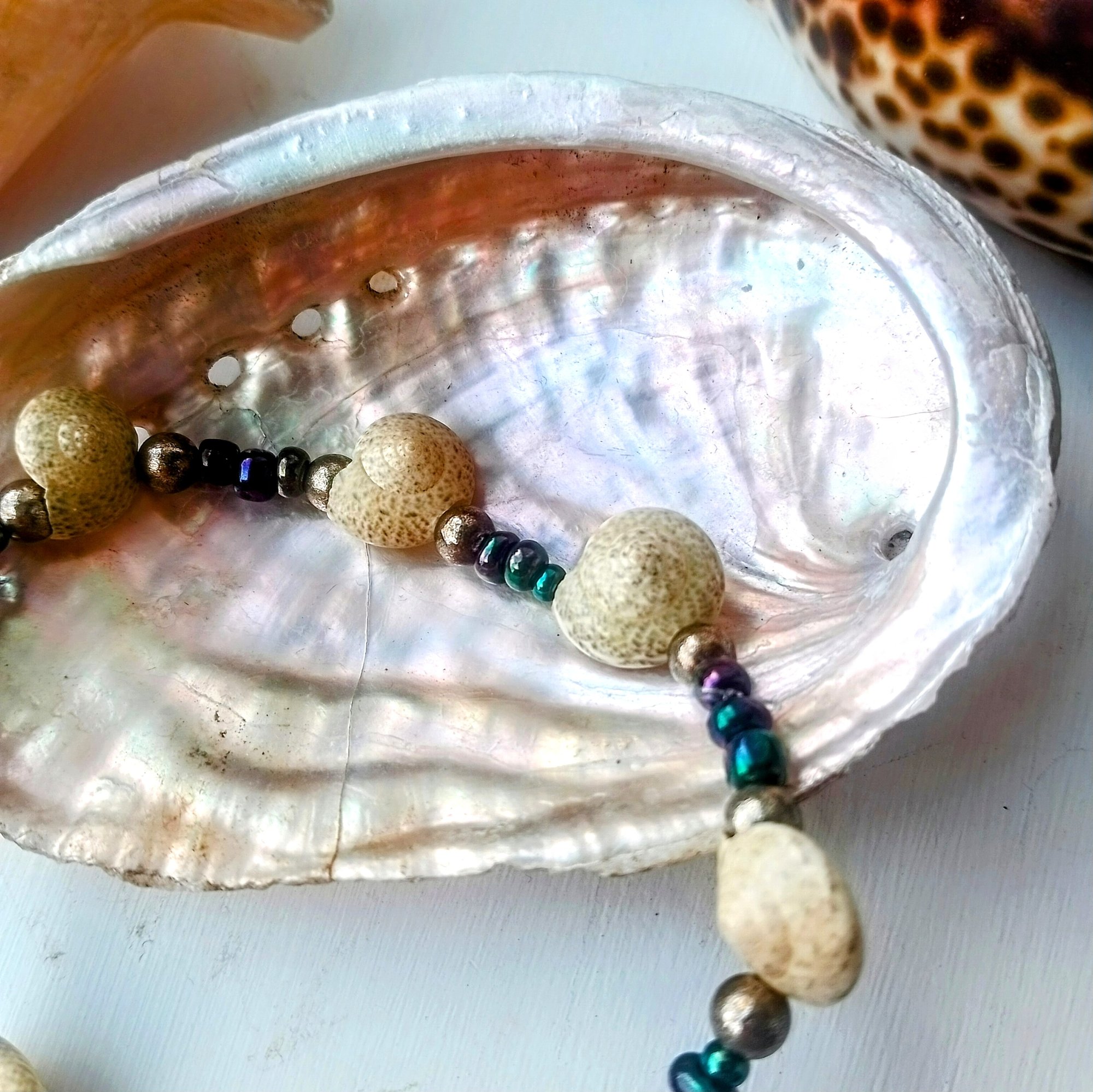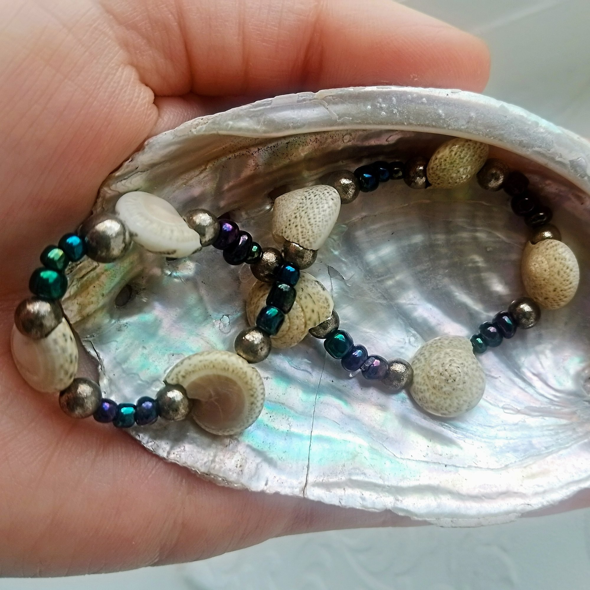 I can imagine this bracelet being on the wrist of a merfolk as they swim through coral reefs and embark on aquatic adventures. It features pearly button top seashells, small metal beads, and tiny metallic pearlescent glass seed beads that echo the colours of deep-sea waves.