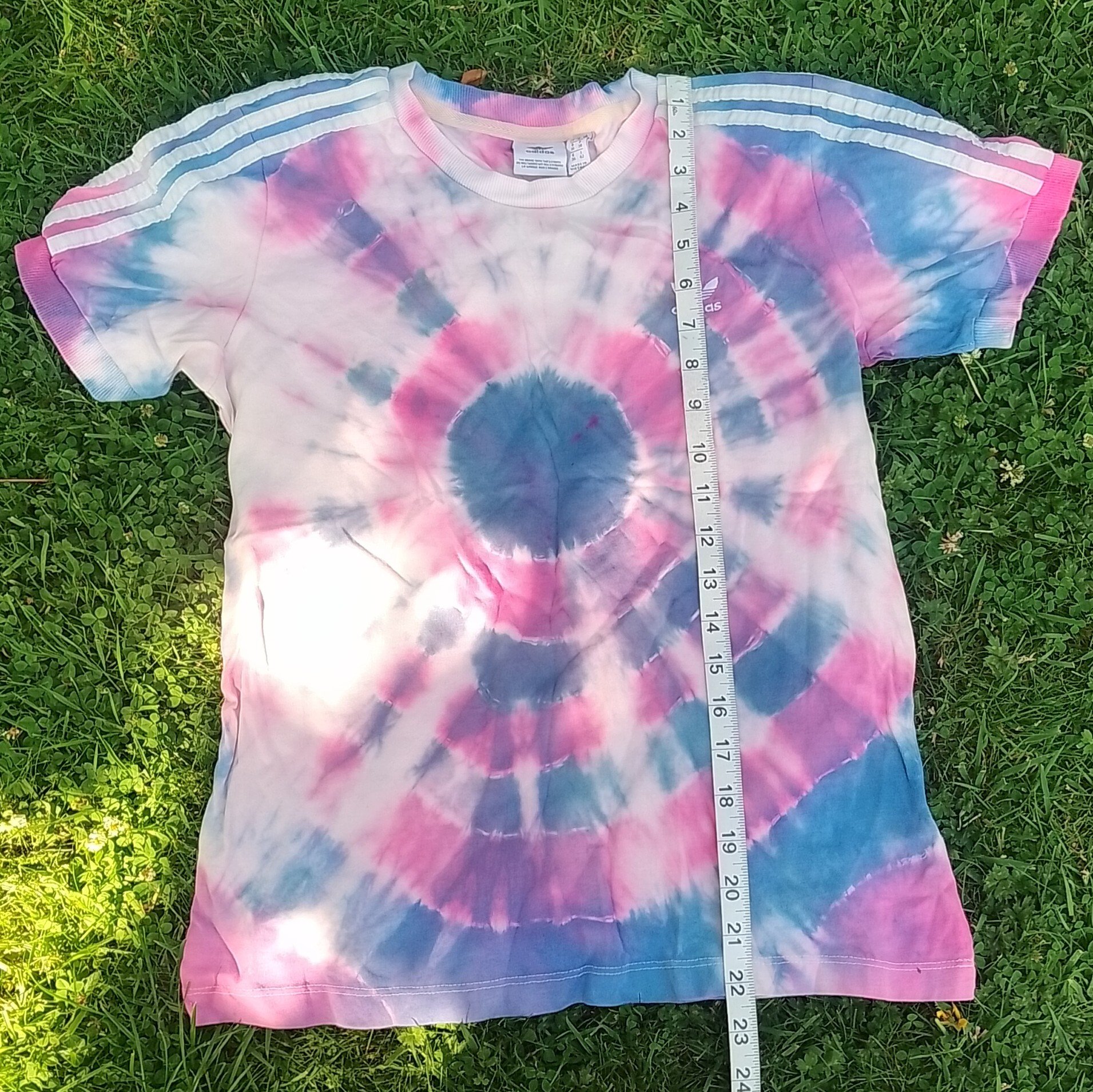 I found this t-shirt at a thrift store where its colour had faded to a sad grey, and it desperately needed a fresh start before it ended up in a landfill. I carefully removed all of the original colour before tie-dying it and bringing it back to life. I love how the Adidas stripes contrast with the waves of colour emanating from the centre of the top, giving it a sporty yet fun appeal. It measures 16 inches flat across the chest (pit to pit) and 22.5 inches in length (shoulder to bottom edge).