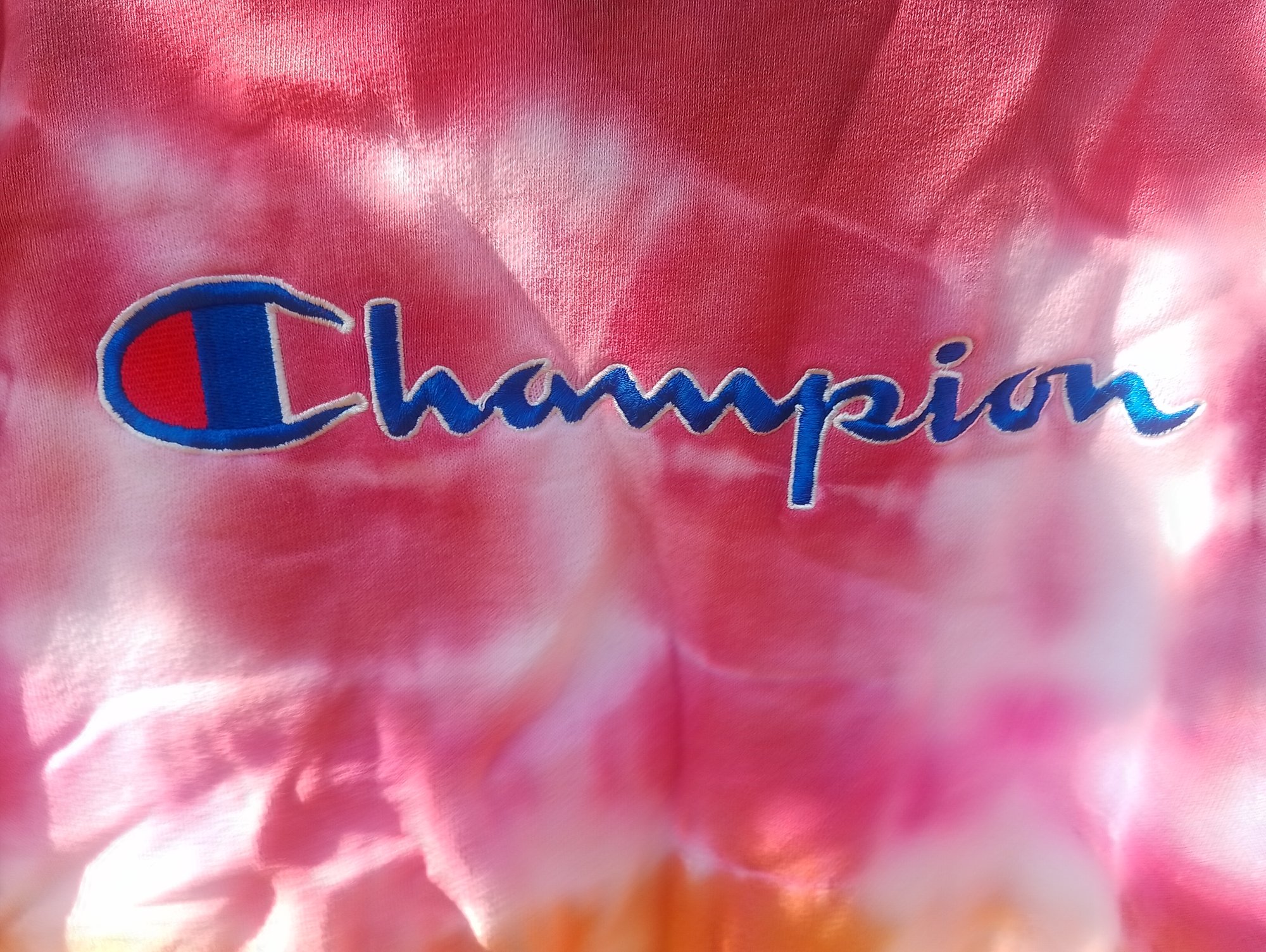 I call this tie-dye job a "tropical sunset" as the colours are so vibrant! Starting with a deep pink down to a summery orange in a slow graduation, it really is a beautiful piece, perfect for summer evenings. I found this sweatshirt looking fairly unloved, and its once pristine white had become a tired beige. With some careful cleaning, washing, and tie-dying, I revamped it to where it's now ready to be loved all over again. The Champion logo on the sleeve and across the chest really stand out against the colourful background and add a sporty-streetwear element to the design.